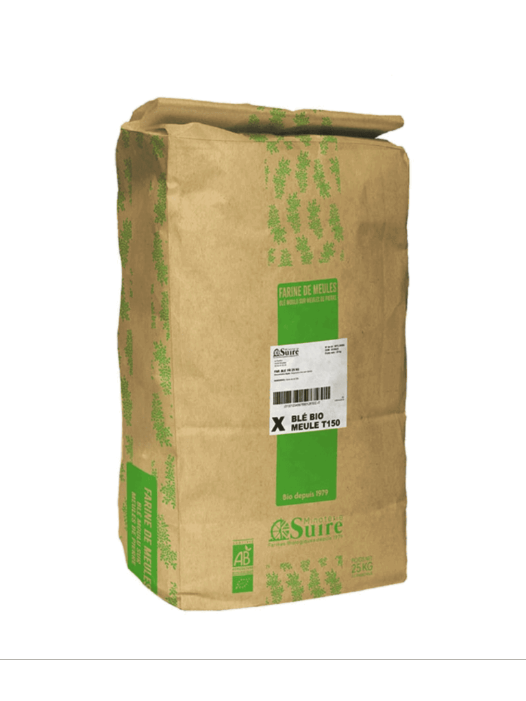 Farine de blé tendre bio T150. Ecrasée uniquement sur meules de pierre naturelle de silex pour une qualité de farine exceptionnelle. Idéale pour la réalisation du pain bio intégral au levain maison. Pour un pain très nutritif, riche en fibres, à la croûte affirmée et à la mie alvéolée et sombre.